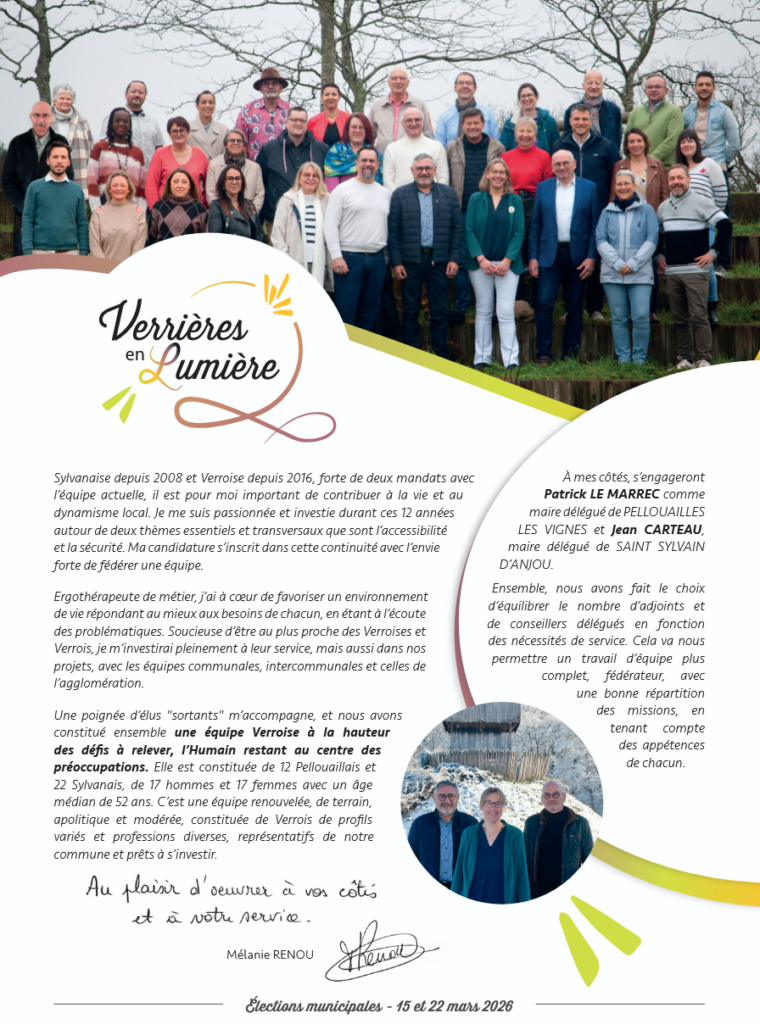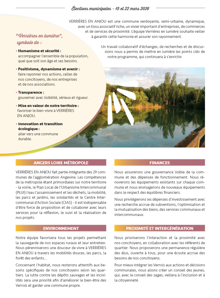 Notre équipe favorisera tous projets permettant la sauvegarde de nos espaces ruraux, et leurs entretiens. Nous pérenniserons une douceur de vivre à VERRIÈRES EN ANJOU à travers les mobilités douces, les parcs, la forêt des enfants… Concernant l’habitat, nous resterons attentifs aux besoins spécifiques de nos concitoyens selon les quartiers. La lutte contre les dépôts sauvages et les incivilités sera une priorité afin d’améliorer le bien-être des Verrois et garder une commune propre.