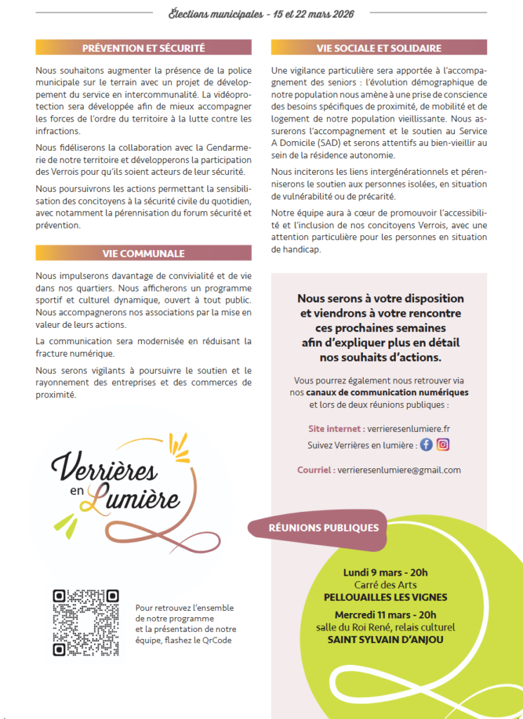 Favoriser l’interaction et la proximité avec nos concitoyens. Il nous faut être pédagogues et intégrer les Verrois aux actions et décisions communales.